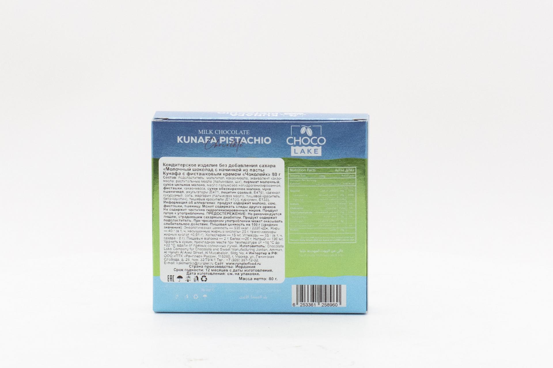 Молочный шоколад Choco Lake с начинкой из пасты Кунафа с кремом Бонелло (Иордания) 80г